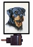 This is a very nice Rottwieler night light with an image by Judy Gibson. This image truly does light up beautifully when lit and is perfect for any room in the house. This light makes a very unique gift and perfect as a stocking stuffer, office gift, or grab bag gift. Photographic image is printed in the USA using high quality inks and is very colorful. **PLEASE NOTE** Unlike cheaper night lights, the light bulb on these decorative lights are fully enclosed! No more seeing an exposed bulb when looking at the night light from the side. You'll love the richness of the light as it provides you with both safety and improved visual attractiveness. This is an extremely well built and solid unit! Unlike cheaper models, this bulb is FULLY ENCLOSED for safety and visual attractiveness. Plug can be rotated to accommodate outlets in any direction. Glass front for vivid visual display. Additional replacement bulb is included with each light (7 watt "night light" bulb). Unit is fully U/L approved.