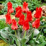 Rock Garden Tulip Bulbs Red Riding Hood: World favorite Red Riding Hood has bright scarlet red flowers with a black interior base and purple mottled foliage. Grows 10-12 tall and makes a big splash with its big blooms.